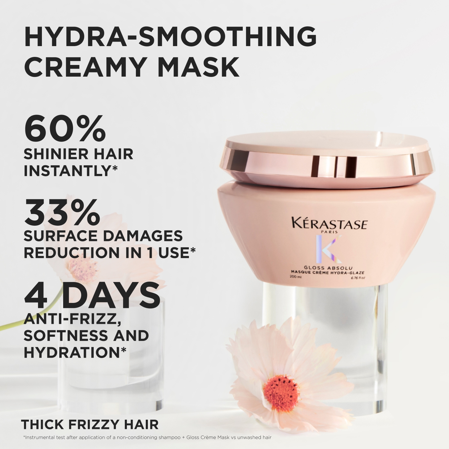 Masque Crème Hydra-Glaze by Kérastase is a hydra-smoothing creamy mask for thick, frizzy hair. It’s specifically formulated with hyaluronic acid, glycolic acid and wild rose in oil to deeply nourish hair and deliver dreamy, bouncy, glossy hair.